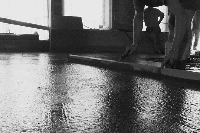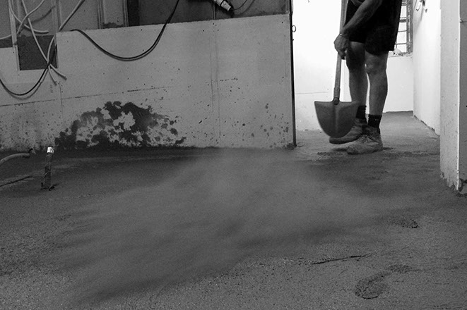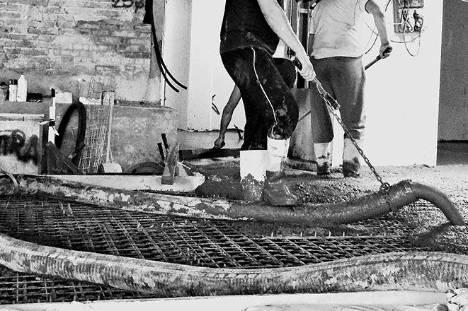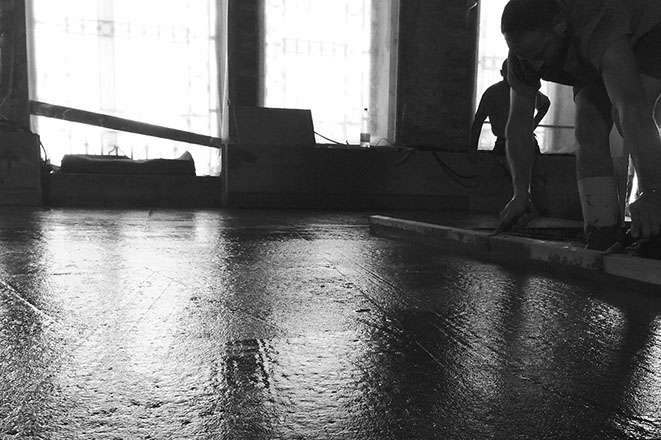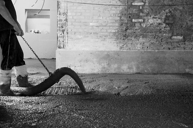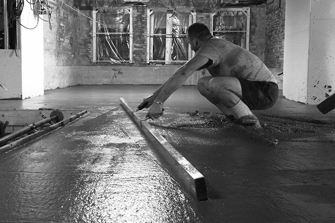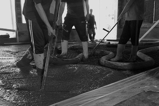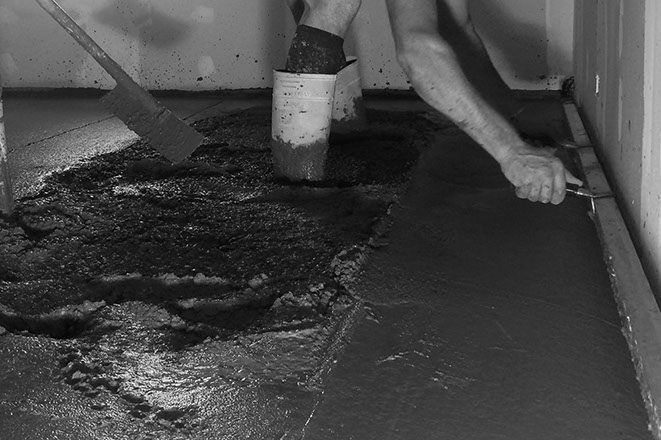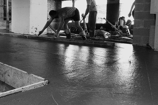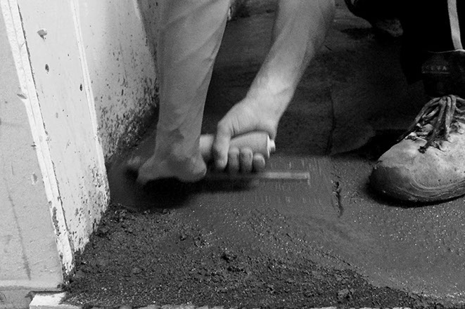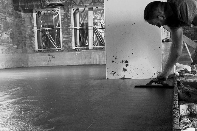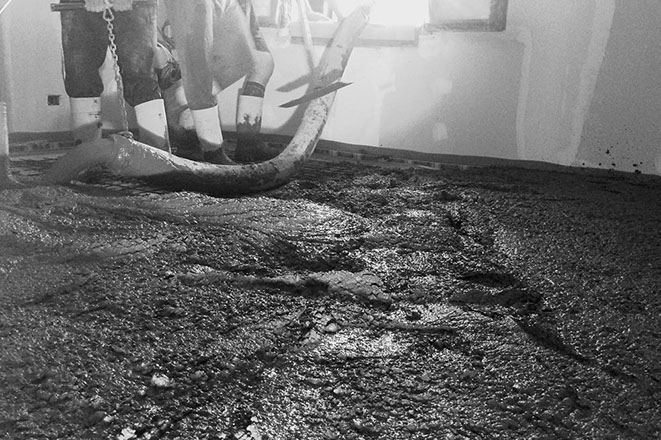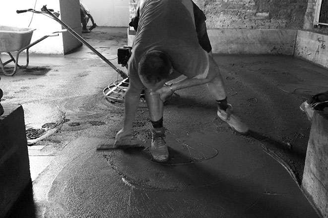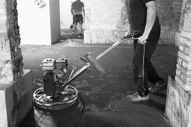 Stesura manuale del cemento, livellato seguendo pendenze prestabilite.