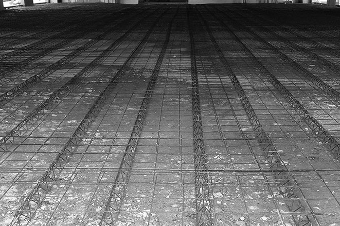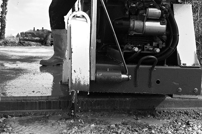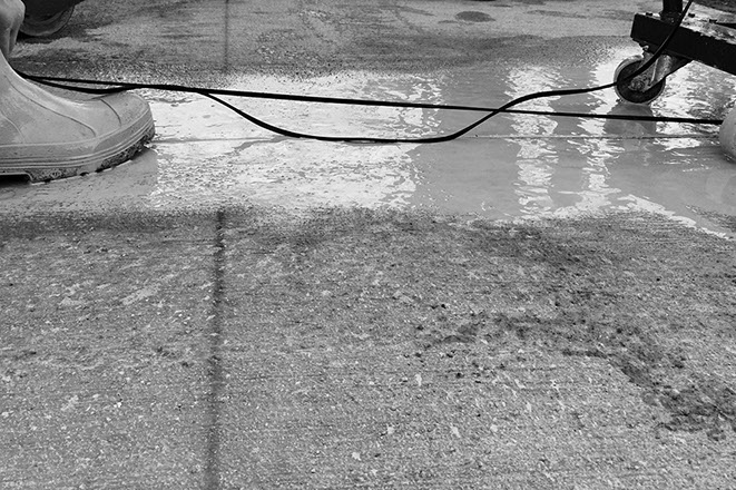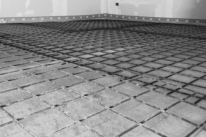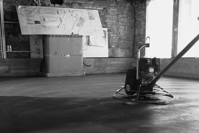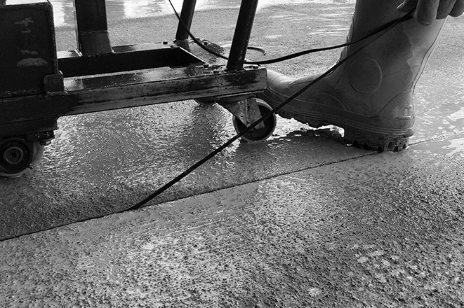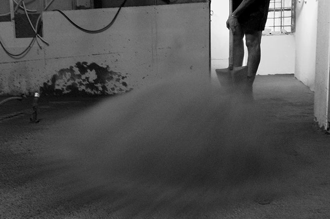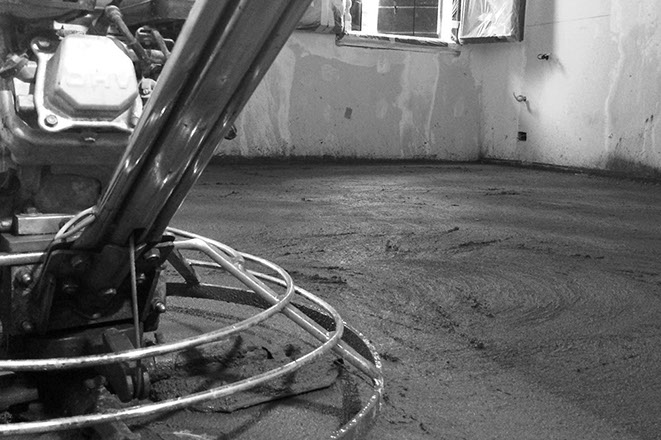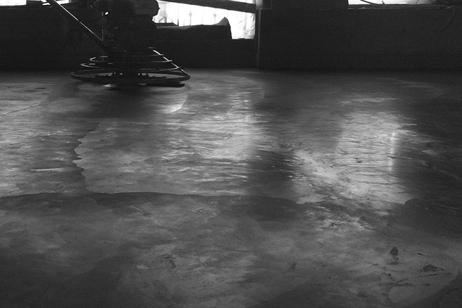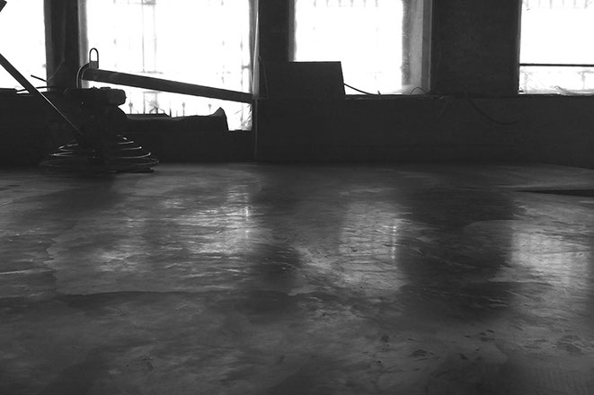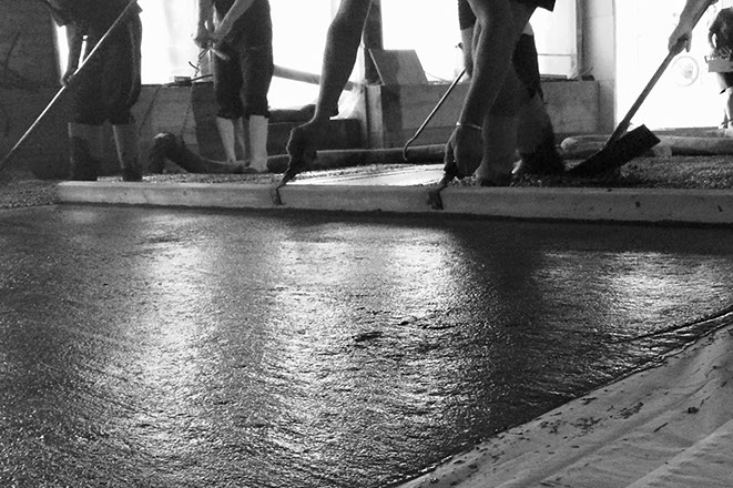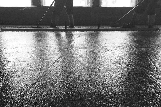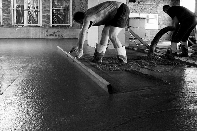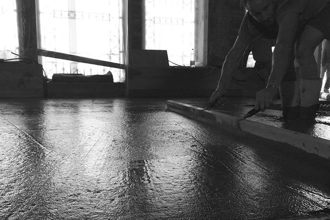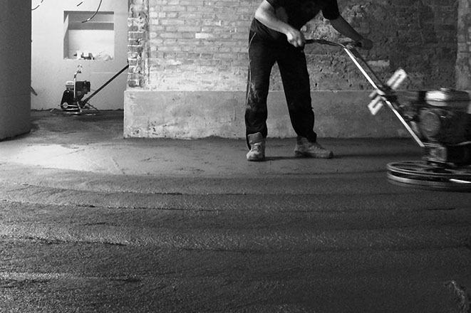 Stesura manuale del cemento, livellato seguendo pendenze prestabilite.